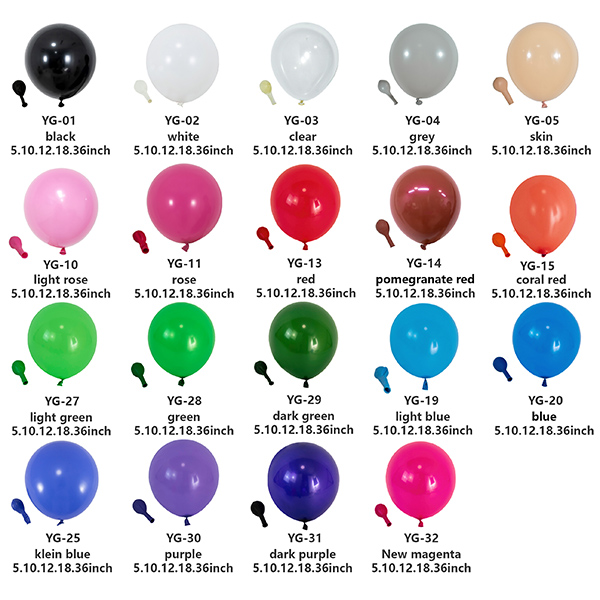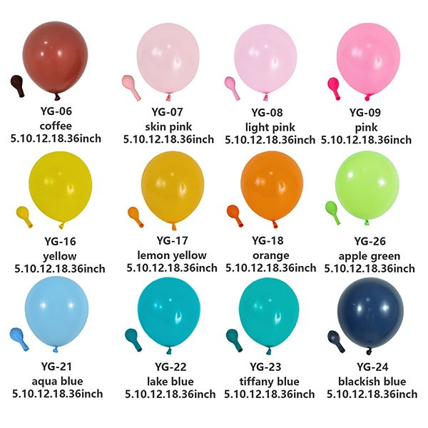 Видовете произвеждани балони включват различни размери (5, 10, 12, 18, 36 инча), форми (кръгли, сърце, ракета, плоски кръгли, кристални), балони със специални ефекти (матови, лъскави, перлени, метални, щамповани, с пайети/пера) балони, за да отговорят на нуждите ви от 10-инчови балони на едро.