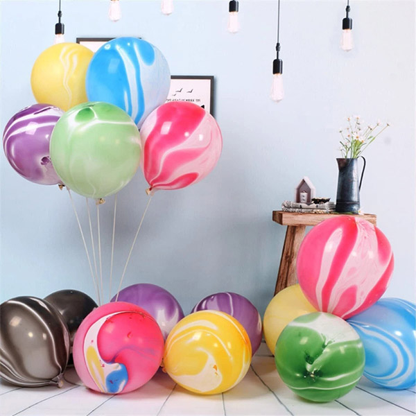 Балонът Agate LaTex, произведен от фабриката за балони Niun®, е изработен от висококачествен латекс, който е издръжлив и красив, няма специална миризма и е по-безопасно да се използва, така че семейството и приятелите са по-сигурни за използване. Балонът с латекс е лесен за връзване, може да поддържа надутото състояние за дълго време и не е лесно да се спука. Този балон от ахат латекс се предлага в 7 цвята, които са смесен цвят, черно, червено, лилаво, синьо, зелено и жълто, а размерите са 10 инча и 12 инча. Ние произвеждаме 100 парчета ахат латекс балони в чанта. Ако имате други изисквания за количество, можем да коригираме и количеството на всяка торба с балони за ахат за вас. Мраморният латекс балони е най -често срещаните балони и могат да се използват за много декоративни поводи, за да добавите радостна атмосфера към вашето парти.