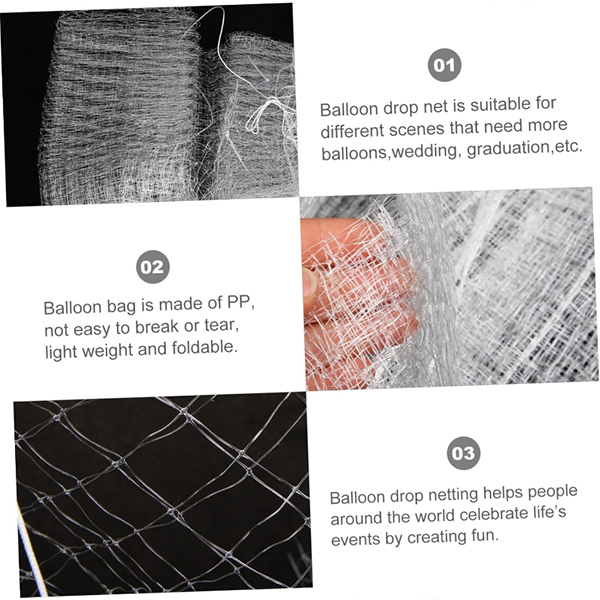 Нашата балонна мрежа може да се използва за всички видове дейности по освобождаване на балони. За изненадващи партита за рожден ден и новогодишни партита, можете да използвате товабалонна мрежаза да изненадате гостите си. Направете незабравими спомени от вашите дейности с тази надеждна мрежа за освобождаване на балони.
