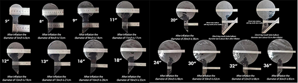 Прозрачните балони Bobo се предлагат в различни размери, изброени тук. Различните размери съответстват на различни модели и общите им надути размери. Можете да персонализирате размера си съответно.