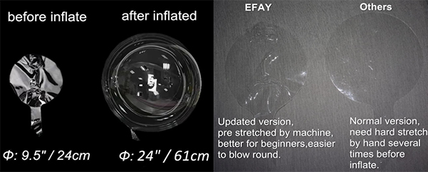 Тези балони с широка уста изискват значителни усилия, за да се простират на ръка. Марката NIUN конкретно разтяга балоните от машината преди доставката, спестявайки ви време и усилия при надуване. За по -добри резултати и по -закръглена форма на балон, препоръчваме да използвате електрическа въздушна помпа.