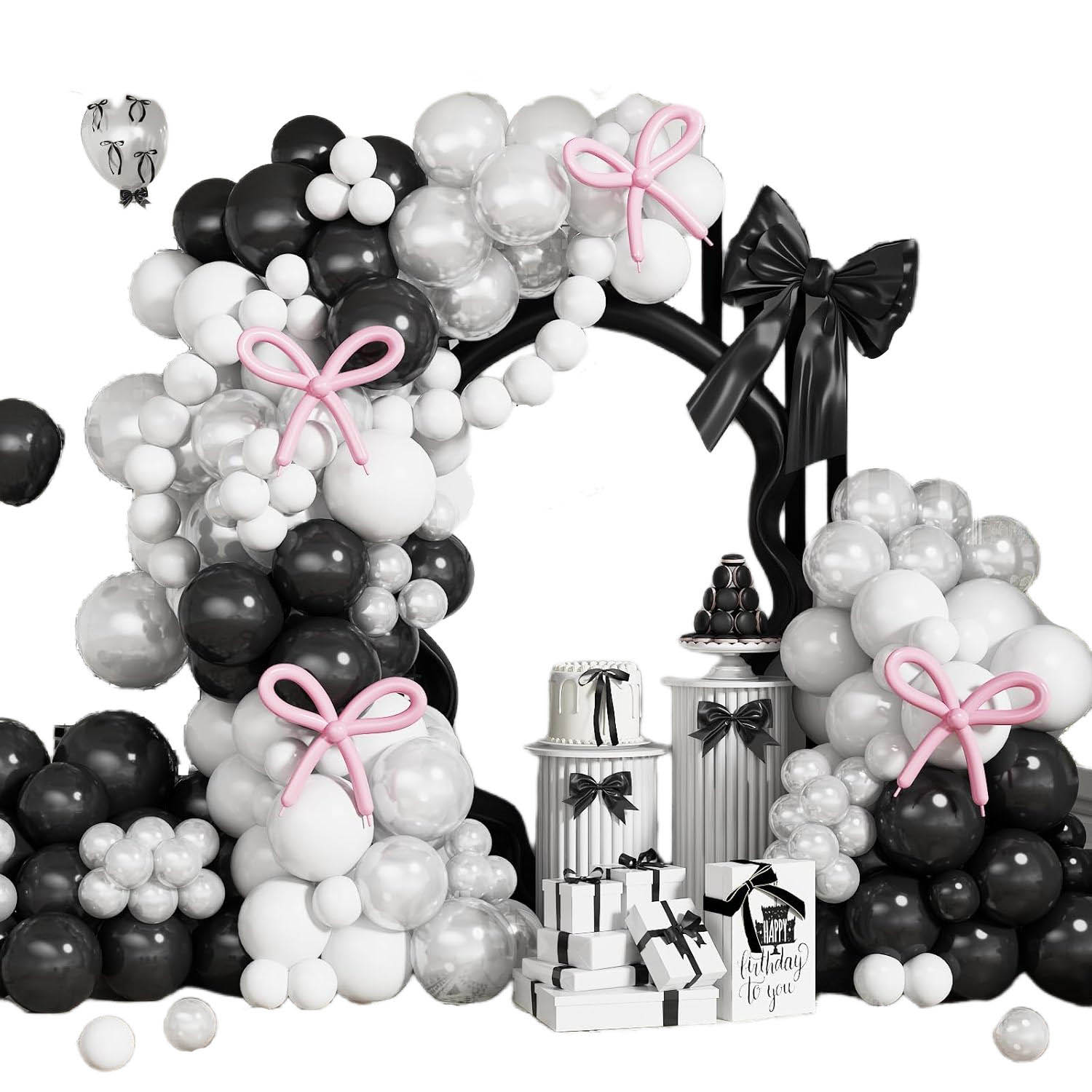 Тази гарландска гарландска балонна гарландка в момента се предлага в различни цветове на балони. Най -новата бяла и черна балонна гарландска гирлянда е популярен избор сред клиентите, тъй като е най -популярният цвят. Белият и черен балон венец арка се сдвоява красиво с честит фон за рожден ден. Акцентите на лъка подобряват общия комплект балон за рожден ден, добавяйки нотка на искрица и чар на вашето парти.