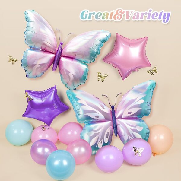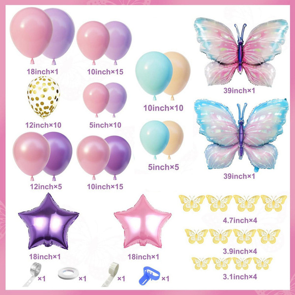 Комплектът гирлянди с балони Butterfly включва основно латексови балони, те се предлагат в различни размери (5 инча, 10 инча, 12 инча и 18 инча). Цветовете им обикновено са доминирани от розово, синьо, лилаво и т.н. За да подсилите ефекта на наслояване на комплекта, можете да видите и прозрачни латексови балони и балони с конфети от латекс. Като тема на комплекта са незаменими и фолийните балони с пеперуди. Повечето от цветовете им са ярки (синьо/розово/лилаво...), а средният размер е 18-30 инча (с налични размери по избор). В допълнение, те имат много реалистичен външен вид, който е почти реалистичен.