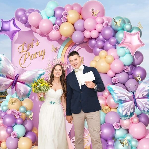 Комплект арки с балони Butterfly: Комплектът арки е цветен и привличащ вниманието, съставен е от различни балони от фолио и латексови балони. Когато го подредите, добавете фонова дъска с шарки и различен текст и след това оградете балоните около него. Той е създателят на атмосферата на събитието. Снимането пред него ще изглежда много красиво.