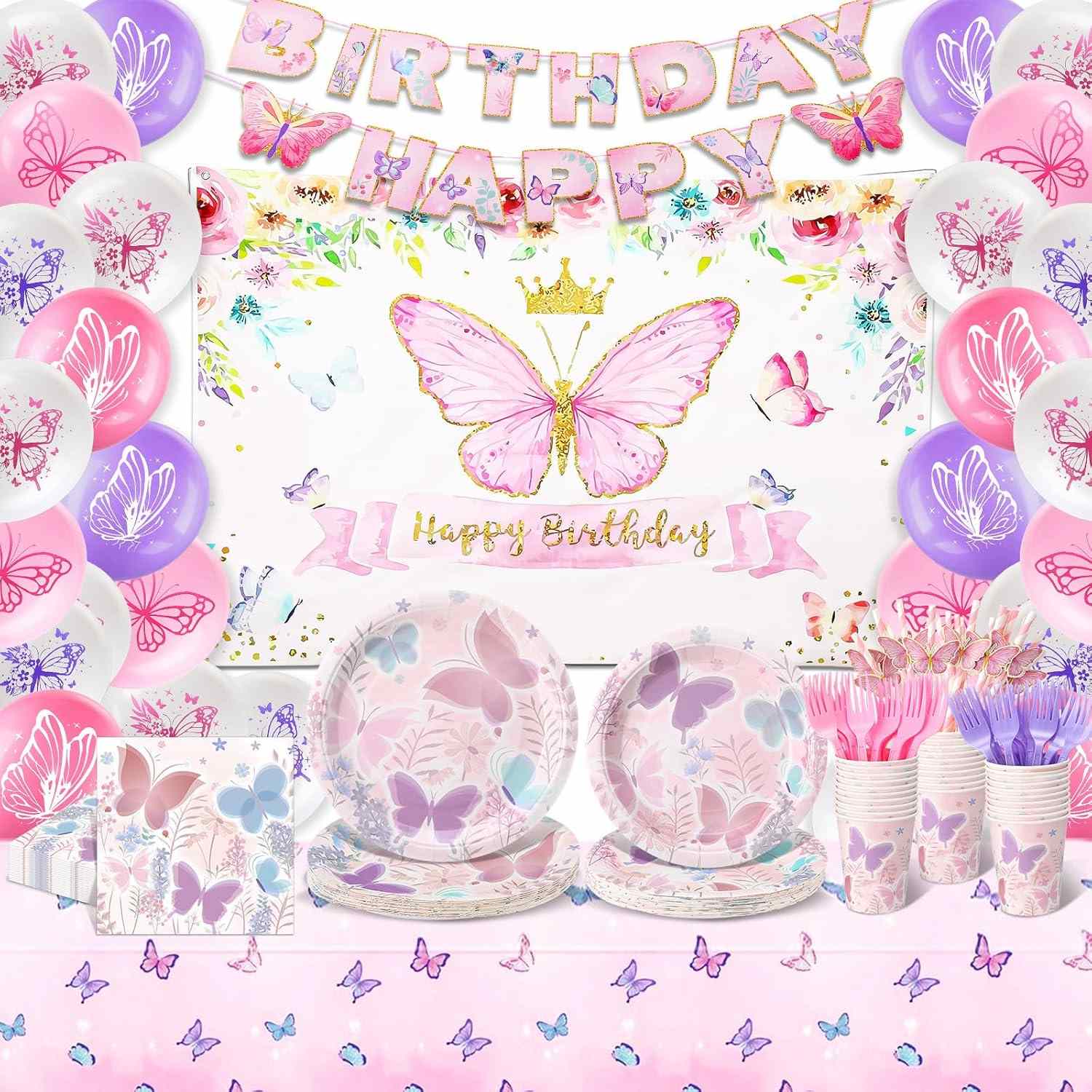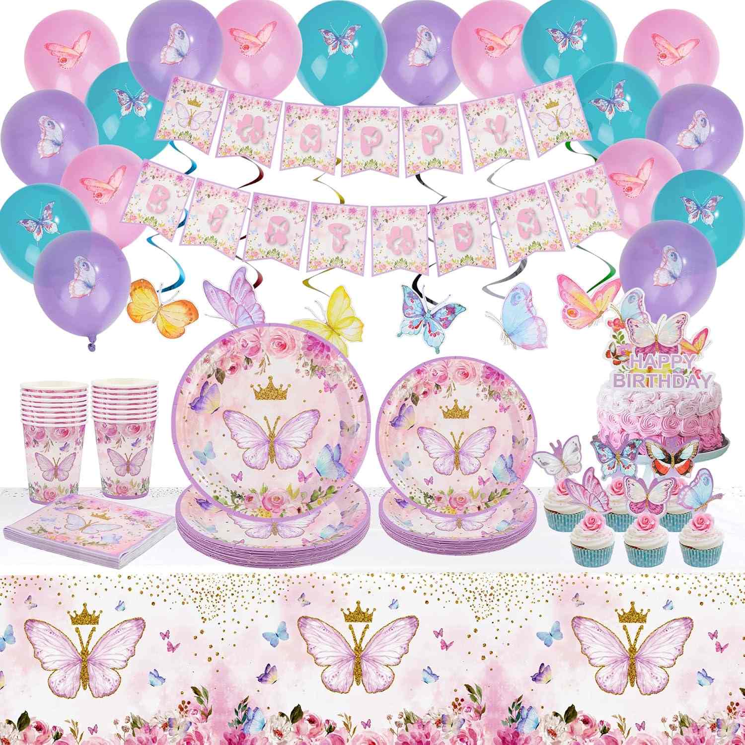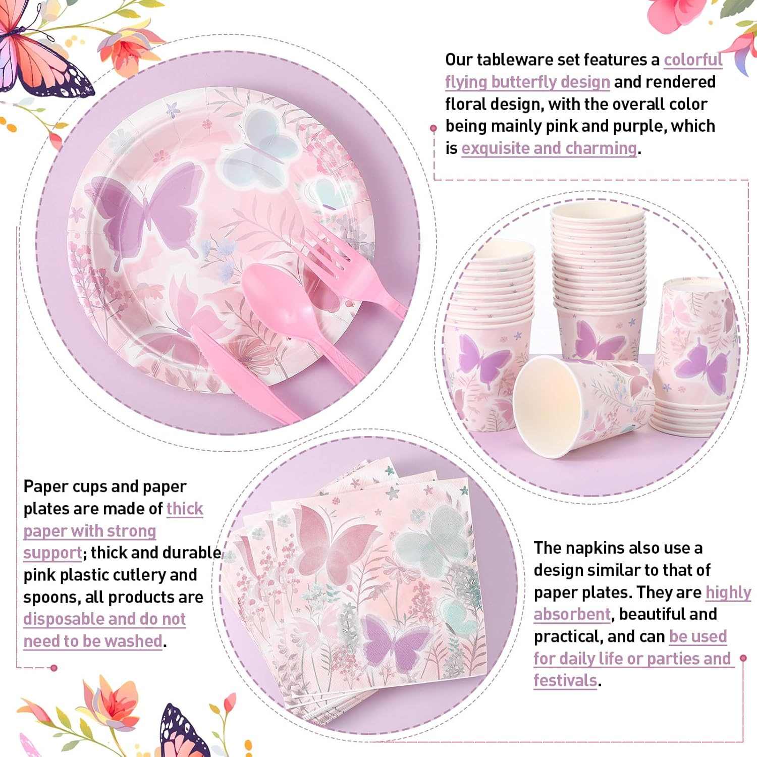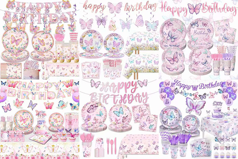 Отлична възможност за парти декор е парти сервизът тип пеперуда. Включени са салфетки, хартиени чинии, хартиени чаши, вилици и ножове. Всяко парче показва части от пеперуди.
