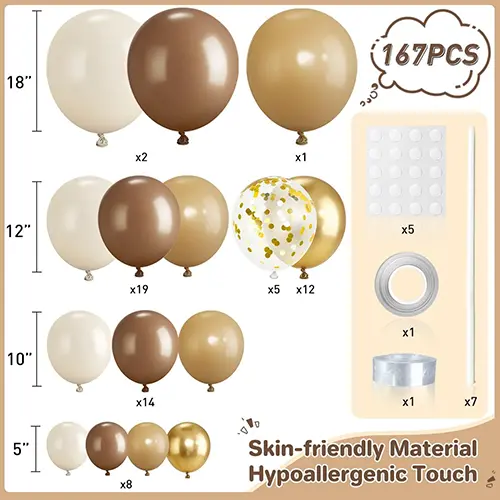 · Включени компоненти: Предварително пропорционални стандартни балони в камилски цвят (с 5 градиентни нюанса), дъгообразна основа с висока якост, професионални съединители, ръкавици с лепило и опростено ръководство за инсталиране.