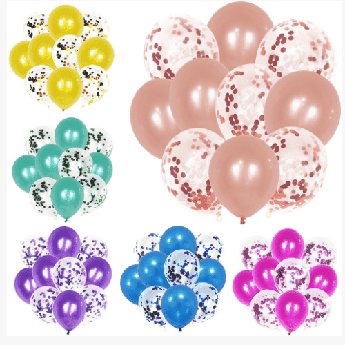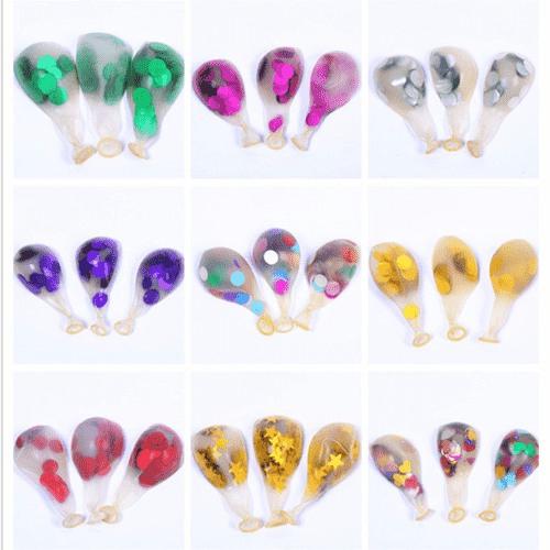 Балоните с конфети обикновено използват 12-инчови прозрачни латексови балони. Всеки балон съдържа 1 g конфети и всяка опаковка може да побере 100 бр. Балоните с конфети с този размер се използват често и имат по-добри резултати, независимо дали в малки костюми с балони или комплекти с венци с балони.