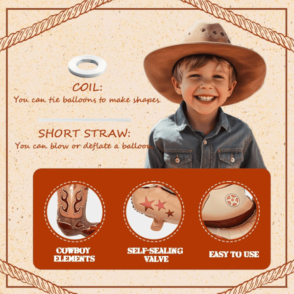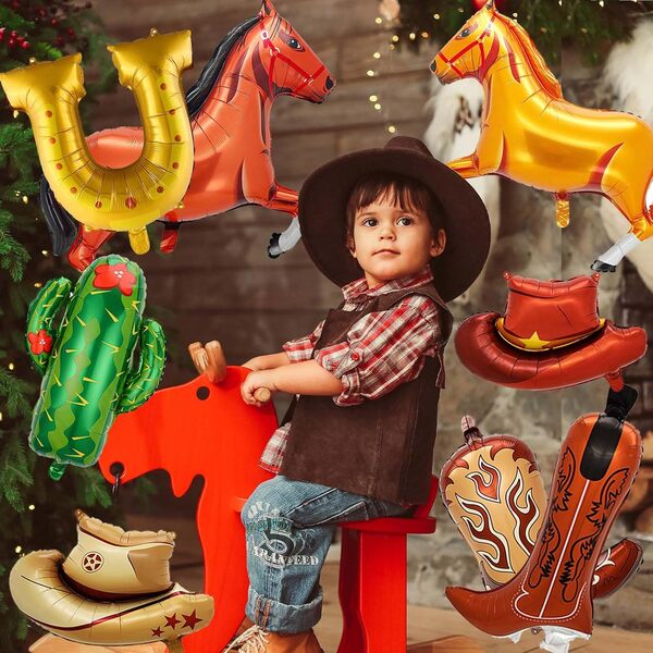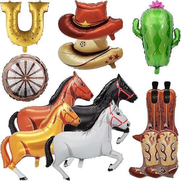 Предлагат се в разнообразни дизайни, от сладки шапки и ботуши до игриви коне, подкови и реалистични кактуси: тези продукти са перфектен избор за тематични партита, филмови вечери, празненства за рождени дни и всякакви празнични събития.Каубойски фолиеви балониса изработени от специално проектирано висококачествено композитно фолио. То е еластично и е малко вероятно да експлодира. Можете също така да го използвате многократно след правилно съхранение. Те са ярко оцветени и притежават голяма изразителна сила. Можете да ги използвате, за да създавате различни комбинации. Например, като използвате 5-10 бр. фолиеви балони (стилове на коне, стилове на шапки, стилове на ботуши..) и 60 бр. латексови балони от кафяв, бял, черен цвят и други аксесоари (фон, банери..), за да направите комплекта гирлянди от каубойски фолиеви балони. Той може да добави силен американски западен привкус към вашето парти, позволявайки ви да се почувствате сякаш самият вие сте каубой. Можете да го използвате на рождени дни, празници или на събития. Ако сте почитател на западните филми, тази тема би била идеална за вас. Налични са балони за купуване на едро от каубойско фолио, за да ви помогнат да намалите разходите и да увеличите печалбите от препродажба, което ги прави най-добър избор както за организатори на събития, магазини за партита, така и за дистрибутори.