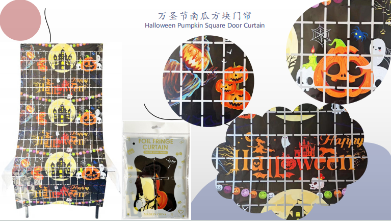 Като зелено и червено фолио за коледно тематично фолио, черна и оранжево фолио с тематика на Хелоуин и завеса за фолио с тикви, прилепи, паяци и други форми, които могат да се използват за празнична декорация в домове, търговски центрове, барове и други места.