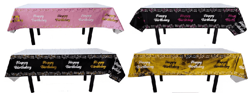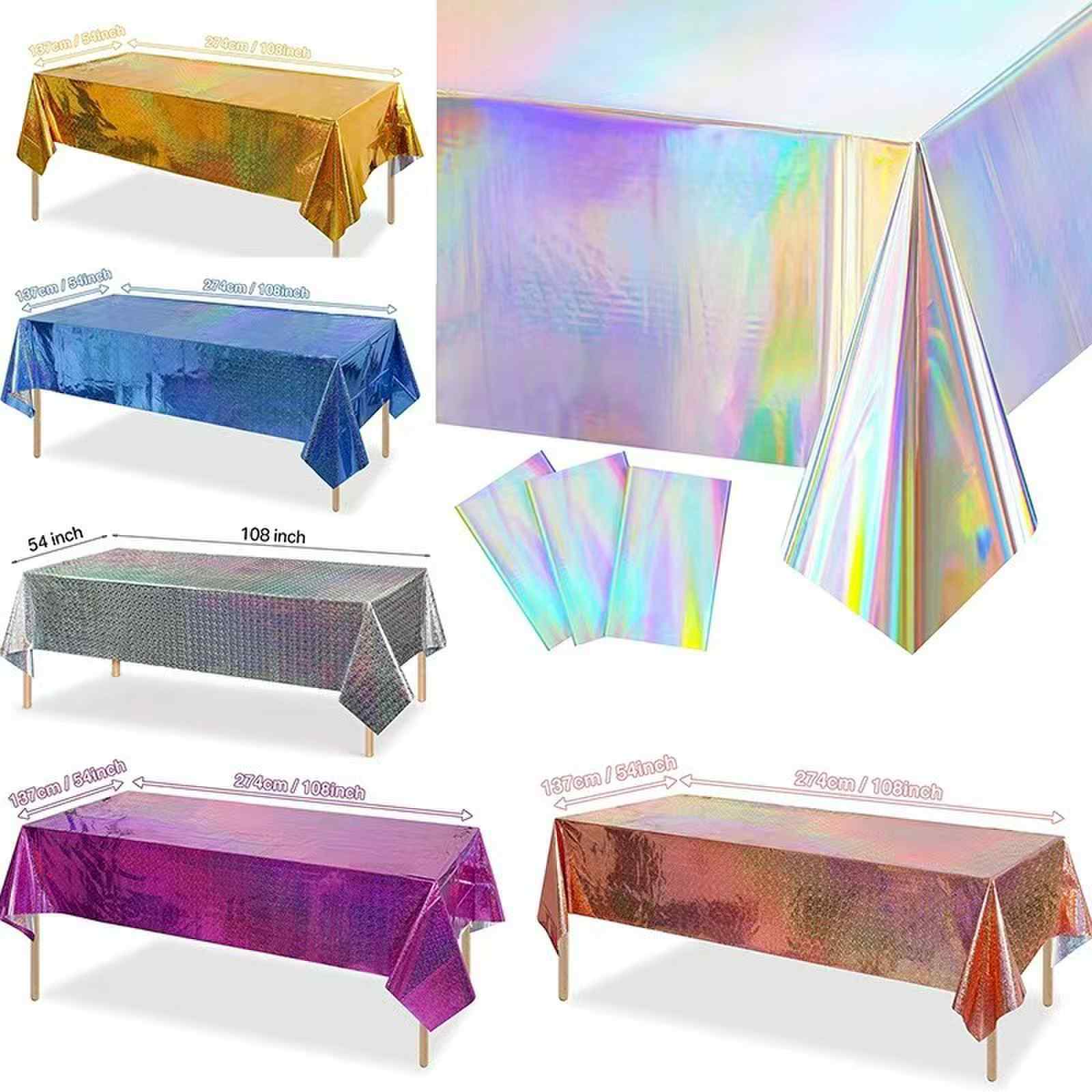 цвят дъга, покривка от фолио с анимирани животни и шарки за торта, подходяща за детски рождени дни; златен, сребрист, лазерен цвят със звезди и шарки на букви, подходящи за партита за рождени дни за възрастни, празненства за годишнини, приятелски партита и т.н., могат да бъдат подредени в семейни трапезарни маси, хотелски парти маси, маси за пикник на открито и други сцени.
