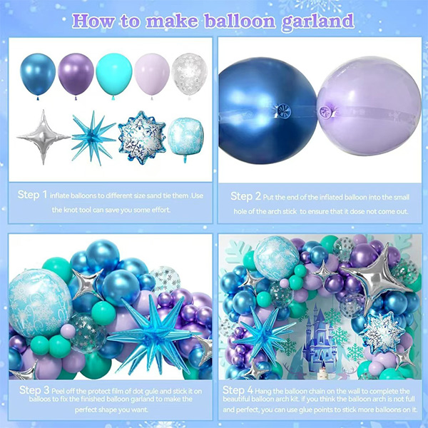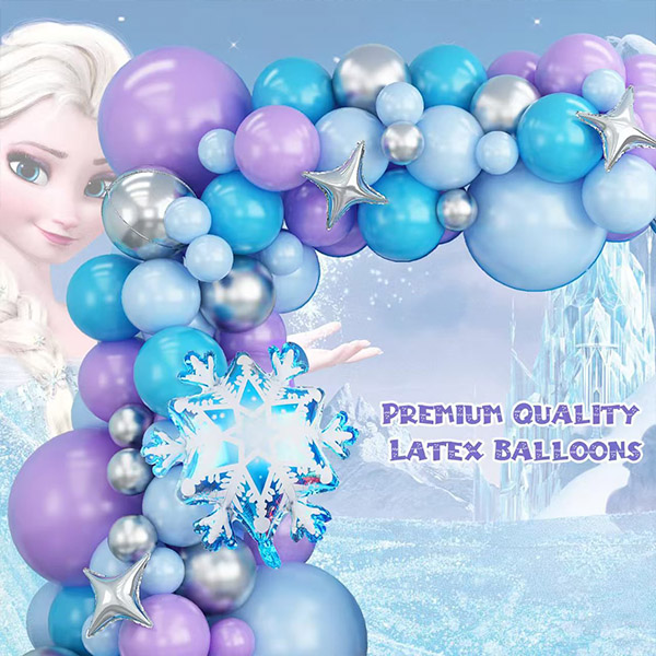 Освен обикновени балони, комплектът включва много елементи във формата на тема. Има големи балони за фолио за снежинка. Те имат деликатни текстури. Те са точно като вълшебните снежинки, създадени от Елза във филма. Можете да ги използвате за изграждане на арка. Можете също да ги използвате, за да украсите фонова стена. Тези цветове се смесват. Те моментално създават атмосфера като да бъдат в лед и снежно царство.