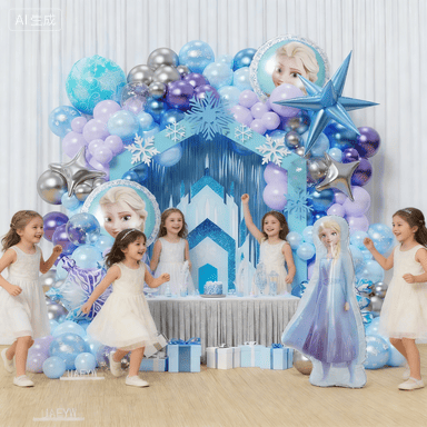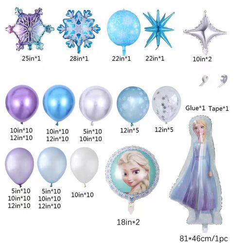Фолиевите балони са основната част от тематичния комплект арка от балон Frozen. Те включват основно фолиен балон с портрет на глава на принцеса, фолиен балон снежен човек. Балонът от фолио с цифри и балонът от фолио с букви също могат да се добавят, за да се създаде по-висока парти атмосфера, сякаш искате декорациите в стила на партито за рожден ден.