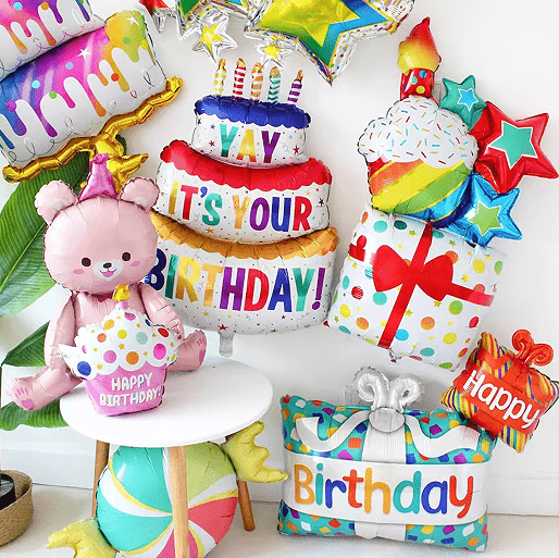 Балонът от фолио Честит рожден ден има по-силно визуално въздействие и усещане за високо ниво, продуктът е изработен от материал от алуминиево фолио с висок гланц, повърхността има метална текстура, добър отразяващ ефект, блестящ под светлината, може да се превърне във фокус на партито. Класическите модели са пълният комплект от балони с букви Happy Birthday и балони с числа Happy Birthday като "18", "30" и "60". Моделите за моделиране включват торти, любов, звезди, анимационни герои, животни и др., които са подходящи за различни тематични нужди на деца и възрастни.