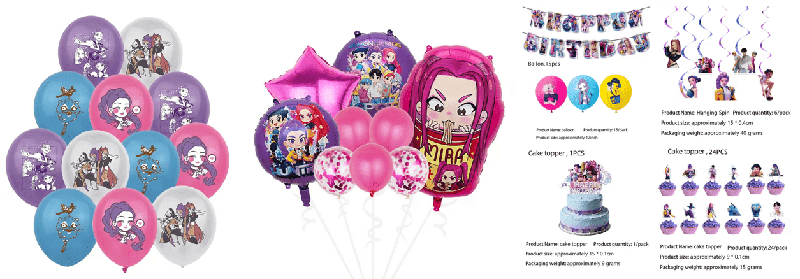 Включва главно темата за ловци на демонищамповани латексови балони, балони от фолио и т.н., които са съчетани с балони и аксесоари за балони от същата цветова система, включително хартиени знамена за рожден ден, плъгини за торти и други продукти, отпечатани с класически изображения на Ловци на демони. Продуктите имат висока наситеност на цветовете и не се избеляват лесно. Използват се безопасни и екологични материали, а ръбовете са заоблени, за да предотвратят случайно надраскване на децата по време на игра и са съобразени с изискванията за безопасност при семейни партита. Продуктът е подходящ за различни сцени, независимо дали е детски рожден ден или фенско парти, той може да отговори на нуждите от потапящо оформление.