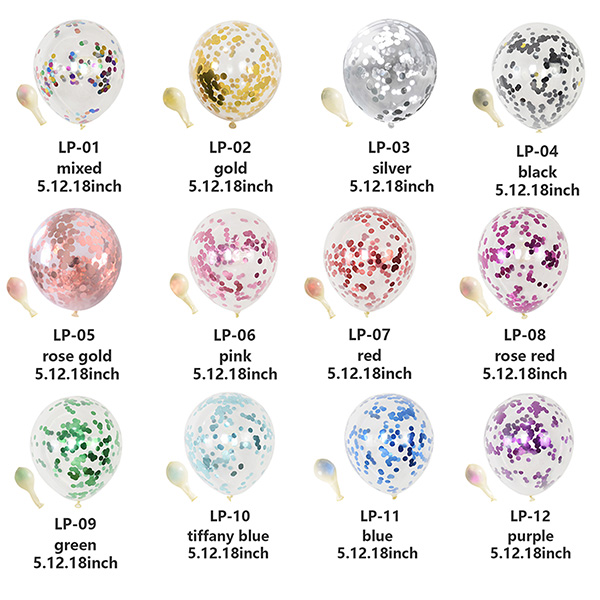 Нашите основни размери балони с конфети са 5 инча, 10 инча, 12 инча, 18 инча, 36 инча. балоните с конфети също принадлежат към латексовите балони, балоните с конфети са разделени на два вида, единият е балони с конфети от алуминиево фолио, а другият е балони с конфети от хартия. Фолиевите блестящи балони изглеждат по-ярки, а балоните от хартиено фолио изглеждат по-меки. Обикновено и двата вида балони с конфети могат да се използват самостоятелно за рождени дни, сватби, детски партита и т.н. също да се използва в декорацията на комплекта с балони, ще добави много цвят към комплекта с балони, също така ще направи декорацията по-съвършена и красива.
