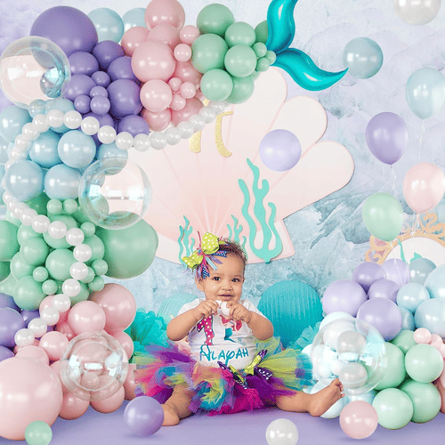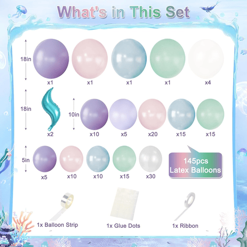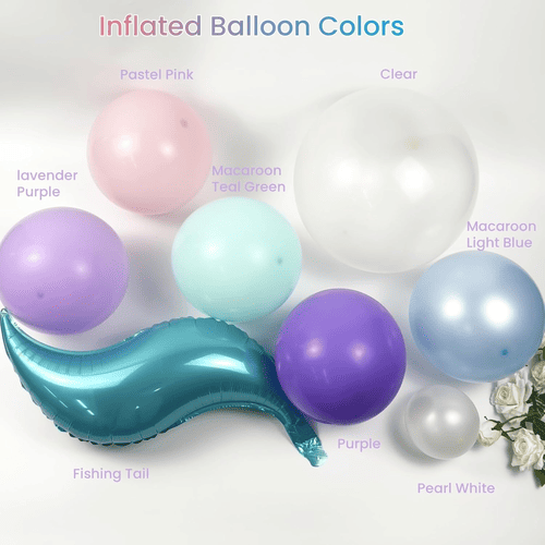 Балоните в балонния гирлянд Mermaid се предлагат в различни цветове, като лилаво, лавандула, пастелно розово, светло синьо, синьозелено, перлено бяло и прозрачни, заедно с декорации от опашка на русалка от фолио, което го прави чудесен за създаване на вълшебно парти на тема океан на русалка.