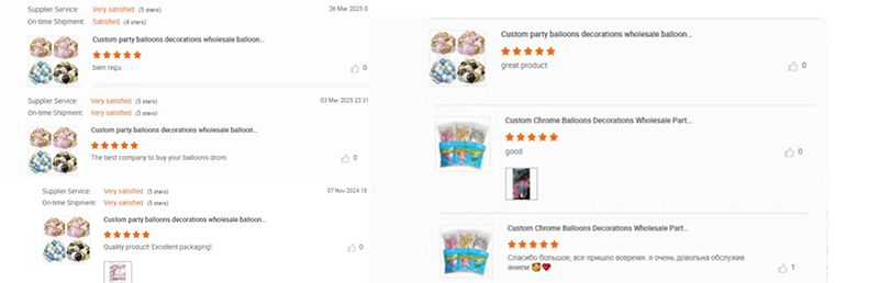 Можете да изберете един единствен цвят металик за опаковката. Популярни опции са шампанско злато, метално зелено, розово злато и т.н. Това прави вашата сцена да се чувства проста и сглобена. Разтяга се много добре. Почти никога не пука. Остава пълен повече от 12 часа след надуване. Можете също така да смесвате различни метални нюанси. Опитайте злато и сребро заедно. Това създава многослоен, привличащ вниманието декор. Съчетайте тези балони и с балони от латекс с конфети. Гладкият блясък на металните балони контрастира с искрящата текстура на тези с конфети. Конфетите се движат вътре, когато ги разклатите. Това добавя забавление и движение към всяко пространство. Малките комплекти балони с метален цвят работят за рождени дни, сватби, празнични събития и витрини на магазини. Всеки комплект преминава строги тестове за херметичност и безопасност. Отговаря на международни стандарти като EN71 и CE. Надуването им е лесно. Дори начинаещите майстори могат да ги използват. Те са обичани и от професионални организатори на събития. Ще създадете пространство с невероятна атмосфера.