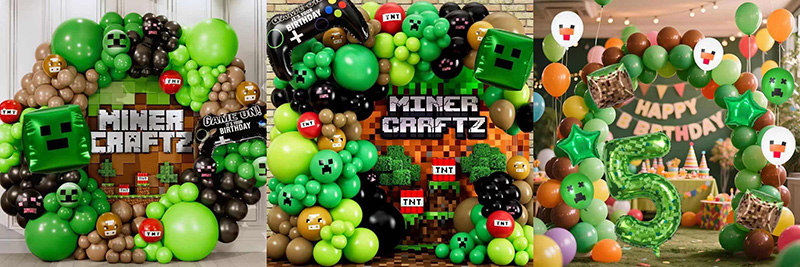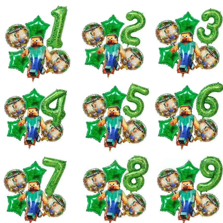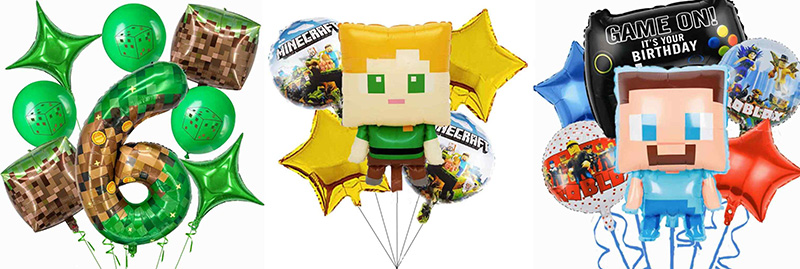 Балоните за фолио на Minecraft са вдъхновени от пикселните модели на трева и мръсотия в играта. Те се предлагат във форми на зелени числа, обхващащи 1 до 9. Текстурата на пиксела върху числата копира стила на играта. Сдвоете ги с съвпадащи тревни блокове и звездни балони. Възрастният дисплей също има външен вид на Minecraft. Те са забавен акцент за партита за рожден ден.