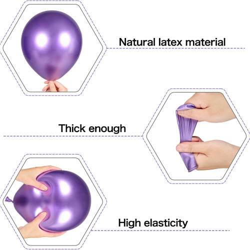 Количеството и теглото на нашите комплекти гирлянди с лилави и черни балони са повече от тези на други марки. Всеки от нашите комплекти арки с гирлянди от балони съдържа поне 100 балона. Всеки размер балон, който предлагаме, използва стандартното за индустрията тегло в грамове. Например теглото в грамове на 12-инчови балони е 2,8 g. Можем също да коригираме теглото на балона в грам, ако имате специални изисквания. Както можете да видите от снимките по-долу, само един от нашите комплекти балони е достатъчен, за да създадете лесно стилна и атмосферна парти сцена.