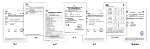 Пълната ни гама от продукти е преминала CPC, CE, EN71 и други авторитетни сертификати, в строго съответствие с европейските и американските и други разпоредби за безопасност на целевия пазар. Тези квалификации могат да помогнат на вашите стоки да преминат безпроблемно митническото освобождаване и напълно да избегнат рисковете от спазване на изискванията на задграничните пазари.