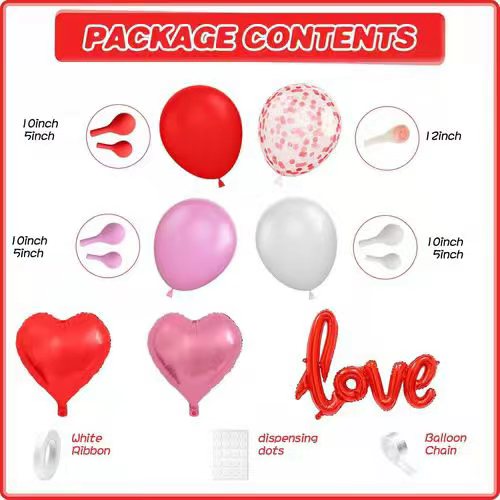 Този комплект балони се състои основно отлатексови балонии няколкобалон от фолио. Латексовите балони при тях са в червен, розов, бял цвят. Изработени са от 100% естествен латекс, който е напълно екологичен и безвреден за човешкото тяло. И размерът им също е различен. За да поставите красив слой, размерите на латексовите балони са от 5 инча до 12 инча. Подреждането им в комплекта е много лесно, с него приготвяме и лепилото за точки и верижката за балони. Така че докато го подреждате, можете да го направите с гъвкавост.