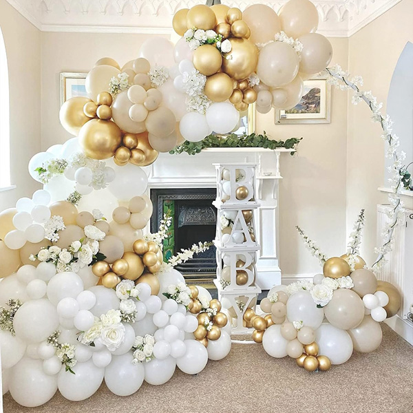 Нашата фабрика наскоро представи новарка от балон в бяло и злато. Този комплект гирлянди с балонна арка се състои основно отматирани латексови балонииметални латексови балони. Ние също имаметочки за залепване на балони, вериги за балони и други аксесоари. Можете също така да оформите гирлянд от балон за парти с фонови чинии, фонови кърпи, знамена за рожден ден и така нататък със съответните теми. Тази арка с балон в бяло и злато има разнообразие от стилове. Белите и златни балони са много красиви, Те се използват широко в различни тематични партита, като сватби, Коледа, рождени дни, годишнини, кръщенета на бебета или други тържества. Можете да направите тези златни и бели балони в арки от гирлянди от балони или можете да ги смесвате и комбинирате с други цветове.