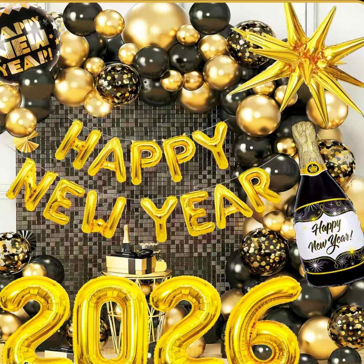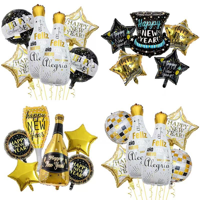 Помислете за комплекта с новогодишна тематика. Има фолиеви балони, които приличат на бутилки шампанско. Включва също балони с числа "2026", декоративни балони със звезди и др. Основните цветове са черно-златисто или златисто-бяло. Пълен е с новогодишно празнично настроение. Лесно може да създаде луксозна и церемониална новогодишна парти сцена.