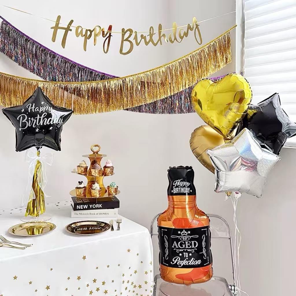 Има и комплект с тематика за рожден ден. Розовите и сладки балони за бутилка вино са проектирани с фолиеви балони във формата на сърце и балони с букви „Честит рожден ден“, а цветът на розовото злато е много романтичен и топъл. Добавя сладко усещане към рождения ден.